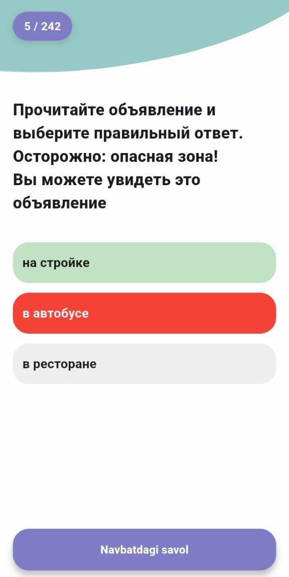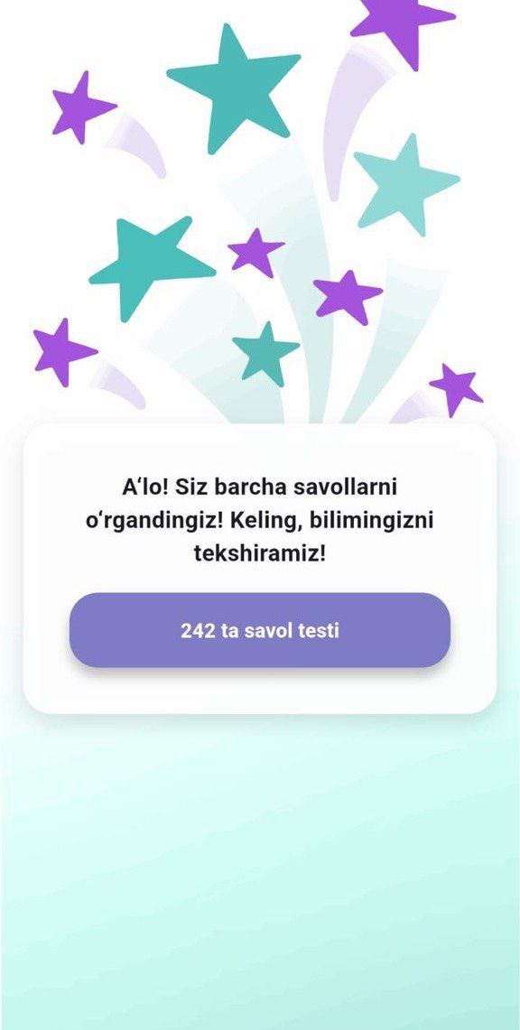 Yod olgan savollaringiz avtomatik ravishda yangilariga almashtiriladi, barcha 242 ta savolni o‘zlashtirmaguningizcha