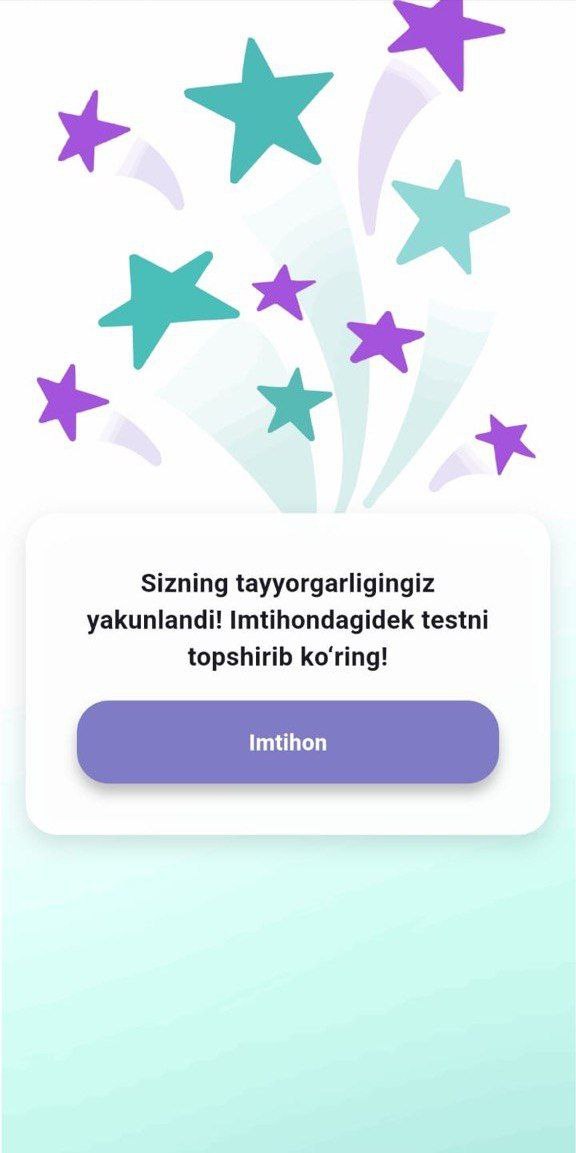O‘qishingizni oxirigacha davom ettiring va biz imtihondan birinchi urinishda o’tasizligingiz ni kafolatlaymiz!