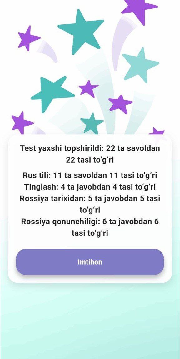 Siz testni imtihondagidek topshirish bilan mashq qilishingiz mumkin (22 ta savol), urinishlar soni cheklanmagan