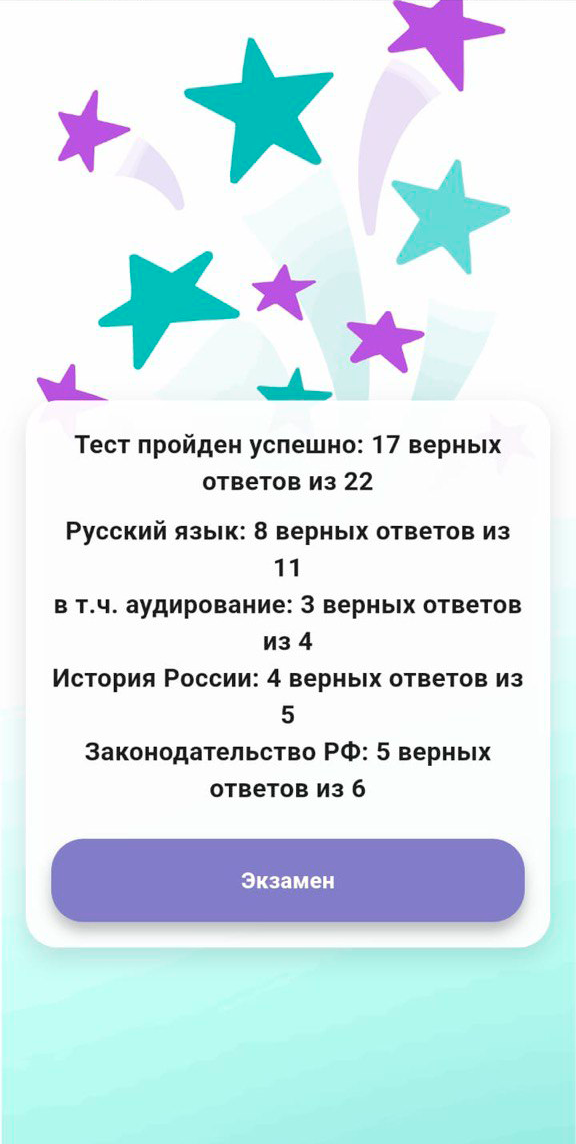 Вы сможете потренироваться сдавать тест как на экзамене (22 вопроса), количество попыток не ограничено